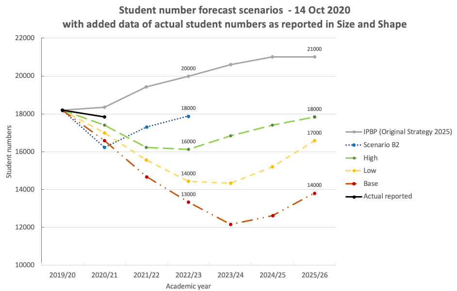 A Financial ‘Gap’ of £15-20 million was identified by the Vice Chancellor at his Open Forum on 30 November 2020 [30:00] (at the time of writing, the VC open forum on 9 February remains unavailable on the website). At this Open Forum an extremely pessimistic graph of student number forecasts was presented. However, as reported in ‘Why Size and Shape is important’, student numbers for the academic year 2020-21 are only about 500 below those for 2019-20. The actual reported figures, then, exceed all the forecasts presented on 30 November and are only just below the original target attached to the 2025 strategy.
