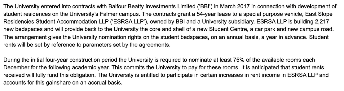 At Sussex the most recent development of on-campus accommodation with 2,000 rooms with rents between £158 and £168 per week is provided and managed through a series of holding companies and a contract with Balfour Beatty. The Balfour Beatty 2019 annual report notes