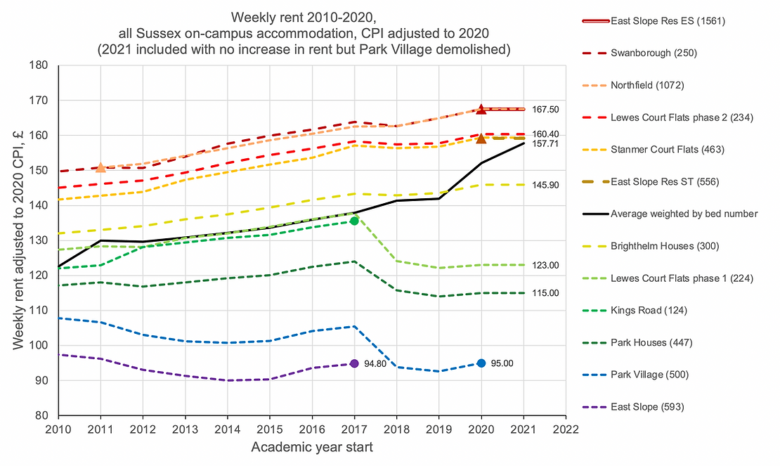 [2] On-campus rents considered here also include the Kings Road residences (on Brighton sea-front) with 124 rooms, up to 2017. These rents are included because they are considered in Council Rent papers [3] up to June 2016. Kings Road residences rent is currently £127.24-£137.24 per week. The Kings Road room numbers account for less than 5% of all rooms. Kings Road residences staged a successful rent strike in 2017. It is not known why they are now omitted from Council papers on rent setting.