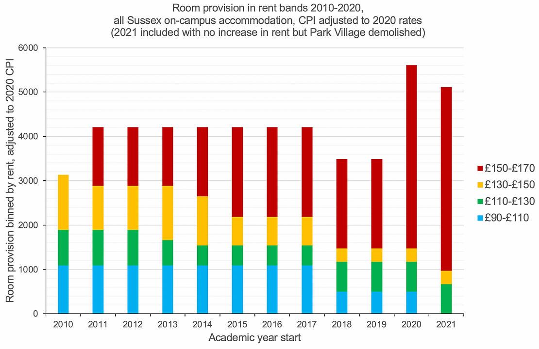 Figure 2 above shows the number and cost of single rooms available on-campus since 2010, again expressed in 2020 pounds using CPI [1]. Weekly rents are split into four groups, in £20 bands, from the most affordable (blue) to the most expensive (red). The data for 2021 is projected with no rent increase from 2020 and no change relative to CPI, but with the removal of Park Village’s 500 rooms, which would have been the last remaining on-campus accommodation in the most affordable band. It is clear that the strategy of the last ten years has been to drastically increase the provision of most expensive rooms while removing all of the most affordable provision.