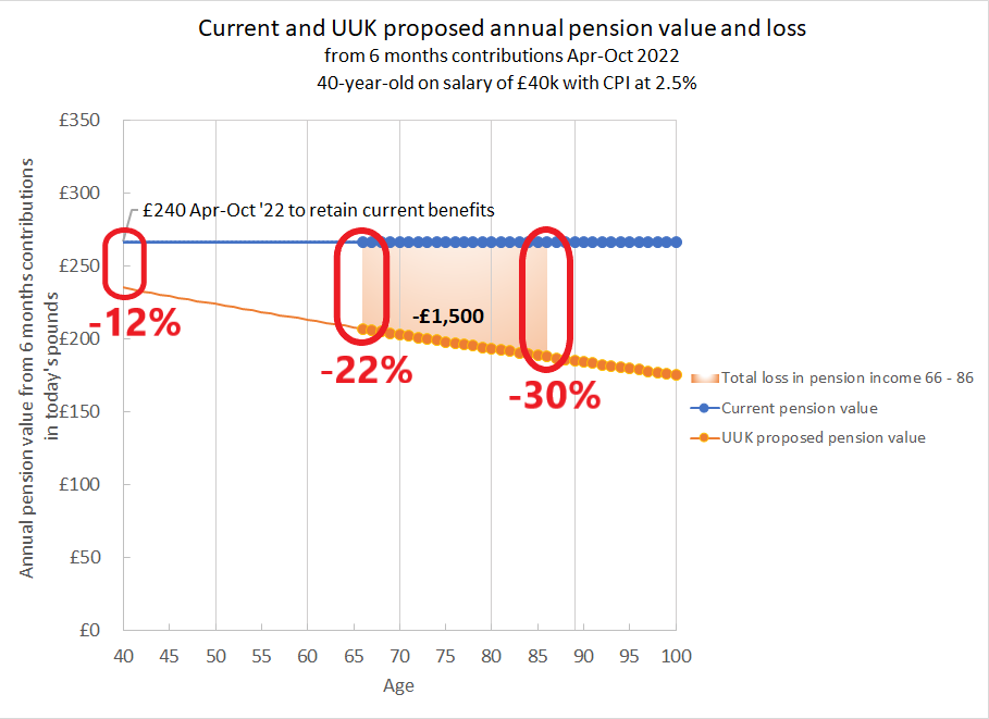 Fig 4: Current pension value and UUK proposed pension value from 6 months contribution, as per USS assumptions used in the USS modeller available with CPI at 2.5%. The cost of retaining benefits for the 6 months April-October 2022 someone on £40k salary is £240. The 12% cut is only the initial reduction in accrual rate. CPI is projected to be 2.5%, the cuts will be larger for higher CPI.