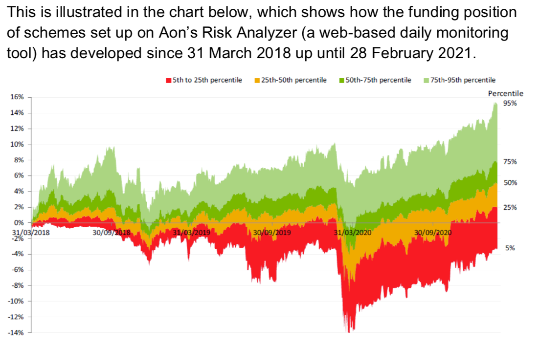 Fig 1: graph from UUK’s actuarial firm AON’s report ‘USS valuation‘, April 2021, p 19, which shows which shows how the funding position of schemes set up on Aon’s Risk Analyzer (a web-based daily monitoring tool) has developed since 31 March 2018 up until 28 February 2021.